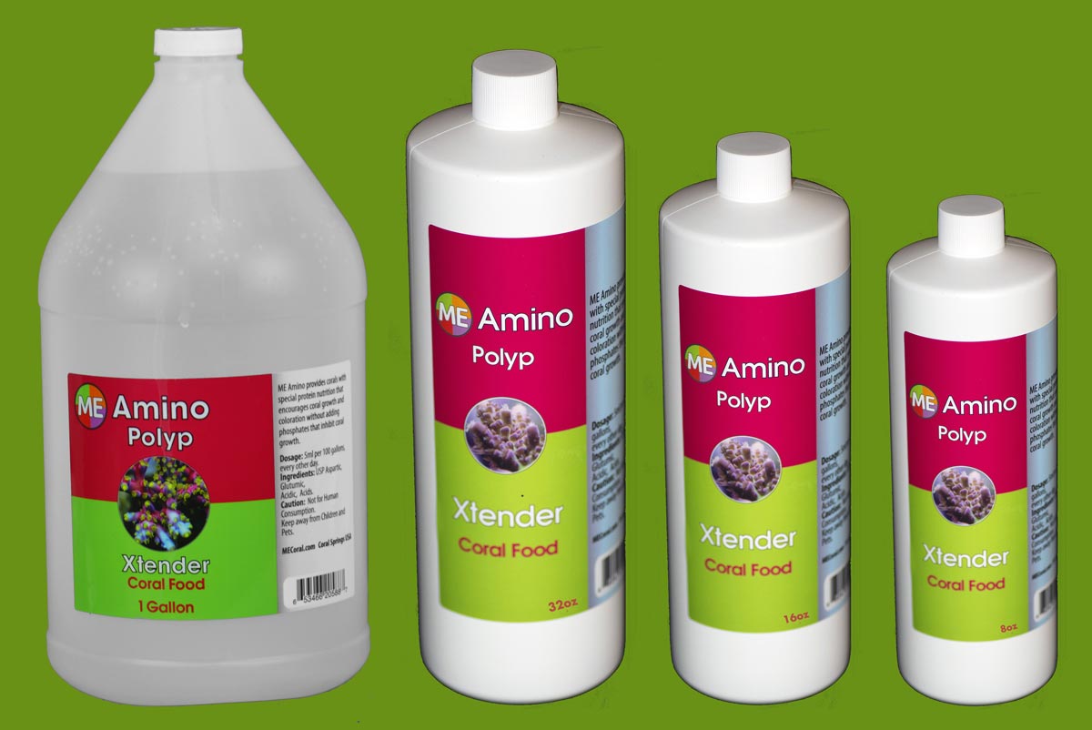 ME Amino is made primarily of a strong dose of Aspartic acid and Glutumic acid. These are the main aminos found in corals organic structure. Corals are able to absorb these protein builders from the water column rapidly. Clearly visible as the coral extends its polyps, or opens its mouth. This consumption or absorption of quality food causes faster growth and coloration from healthier happier corals. If other coral or fish foods were used to provide the same amount of protein it would raise the phosphate levels in our systems causing corals to brown. Aminos are the best way to feed corals without increasing unwanted nutrients in the water.